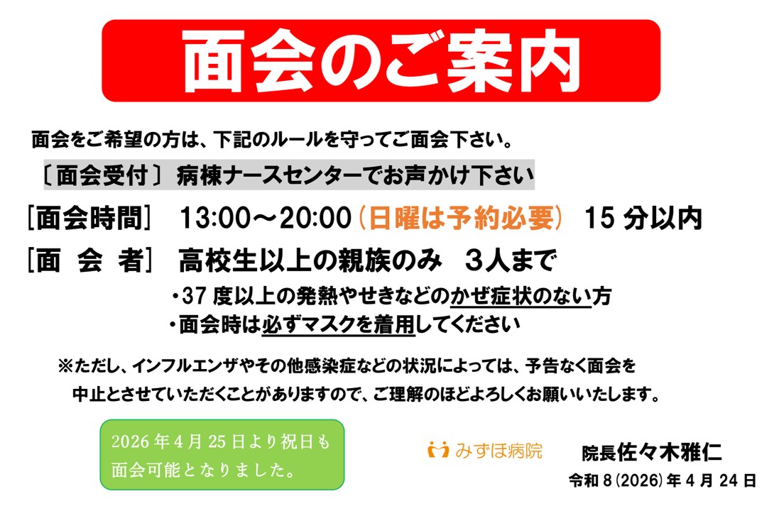 平素より当院の運営にご理解とご協力をいただき、誠にありがとうございます。 当院では感染対策のた面会を制限しておりましたが、4月24日(金曜)より、下記の通り面会ルールを一部変更(緩和)いたします。